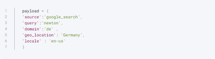 Let's review the payload dictionary from the above example for scraping Google search data.