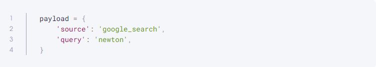 Now, let’s add query – a crucial parameter that determines what search results you’ll be retrieving. In our example, we’ll use newton as our search query. At this stage, the payload dictionary looks like this: