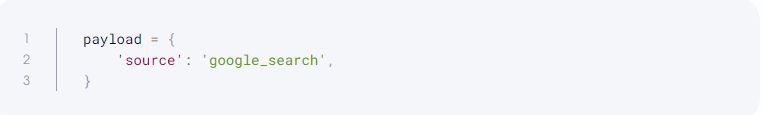 That said, google_search and query are the two essential parameters for scraping public Google search data. If you want the API to return Google search results at this stage, you can use payload. Now, let’s move to the next parameter.