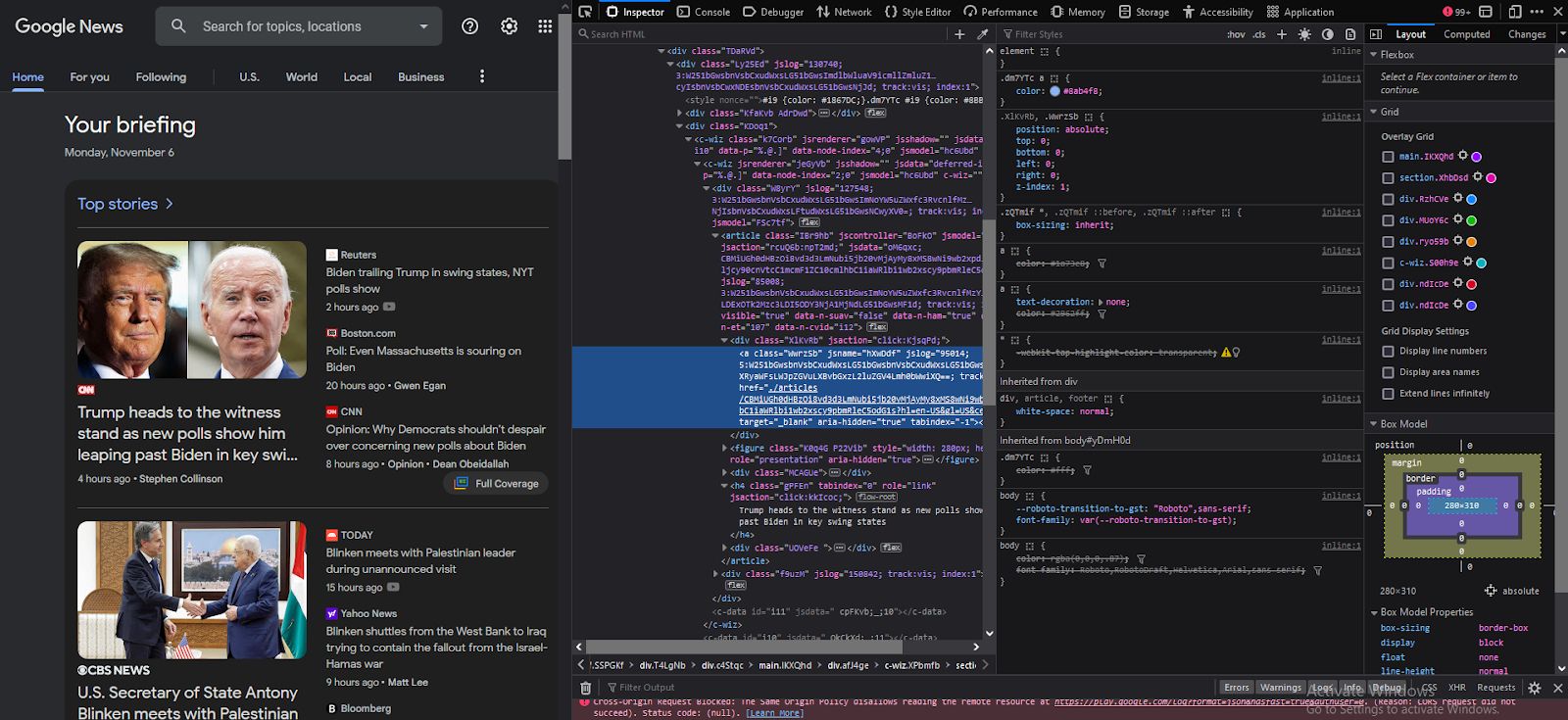 Before you start extracting the news headlines, you need to find the specific HTML elements by using a web browser. Begin by opening the Google News homepage in your web browser and right-click on the page. Alternatively, you can press CTRL + SHIFT + I to access the developer tools, which will appear as depicted below: